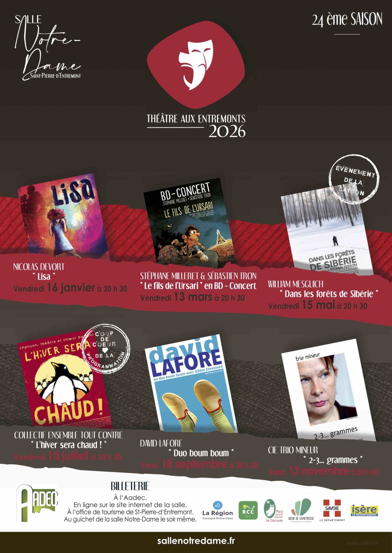 24ème saison « Théâtre aux Entremonts » en cette année 2026, avec un programme « bicéphale » : d’un côté des monologues théâtraux et de l’autre la découverte de genres inédits à Notre-Dame.
